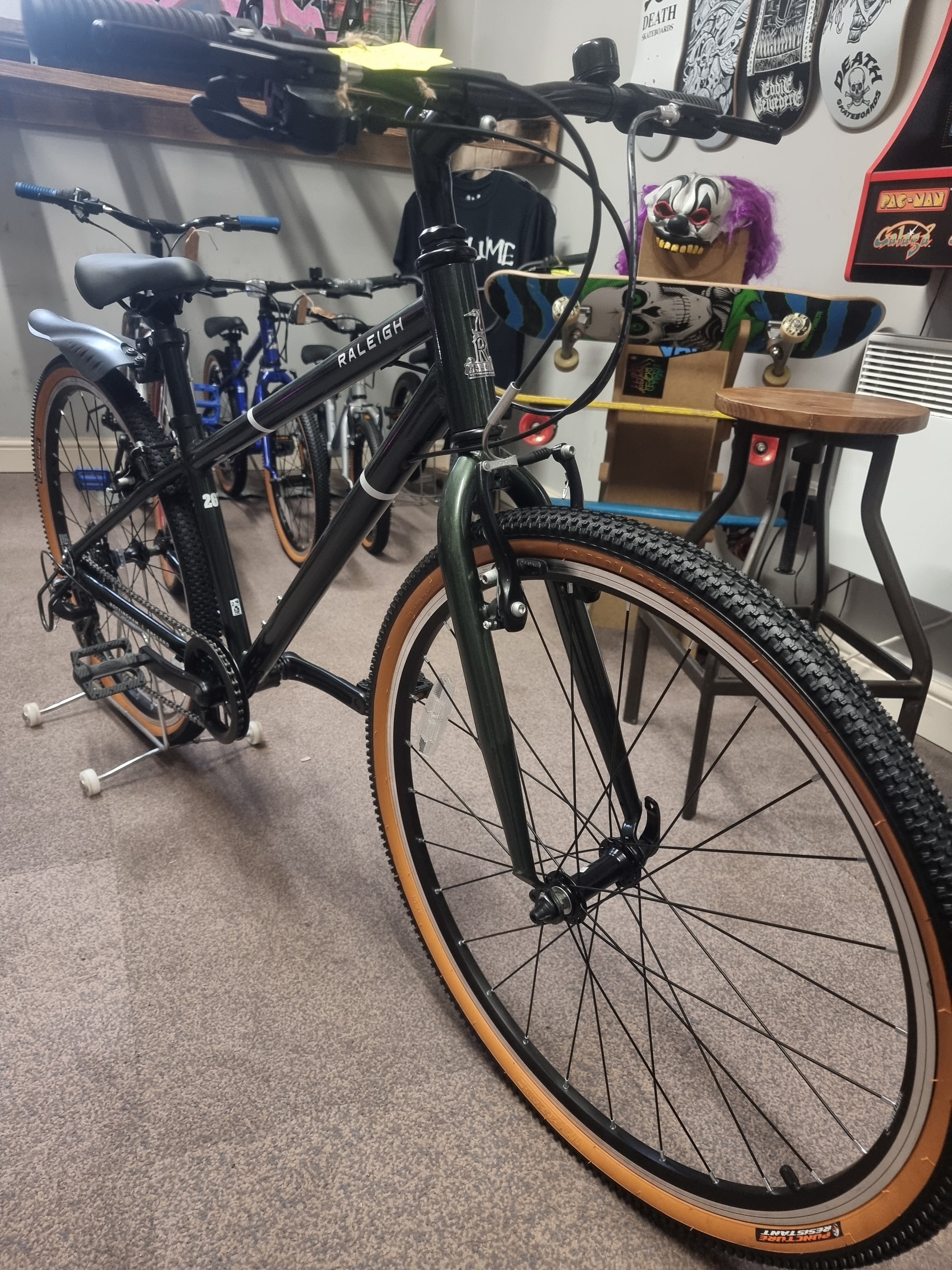 Here we have the largest of the pop range from raleigh in 26" wheel size great for on or off road through the woods it's capable for all situations in pearl green its a great looking bike with 8 speed trigger shift gears